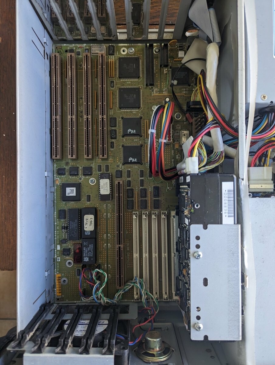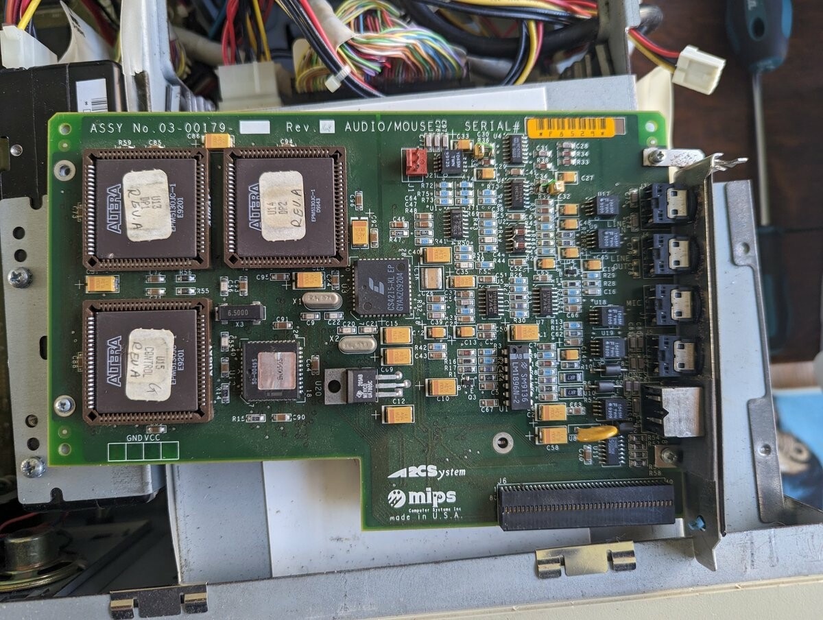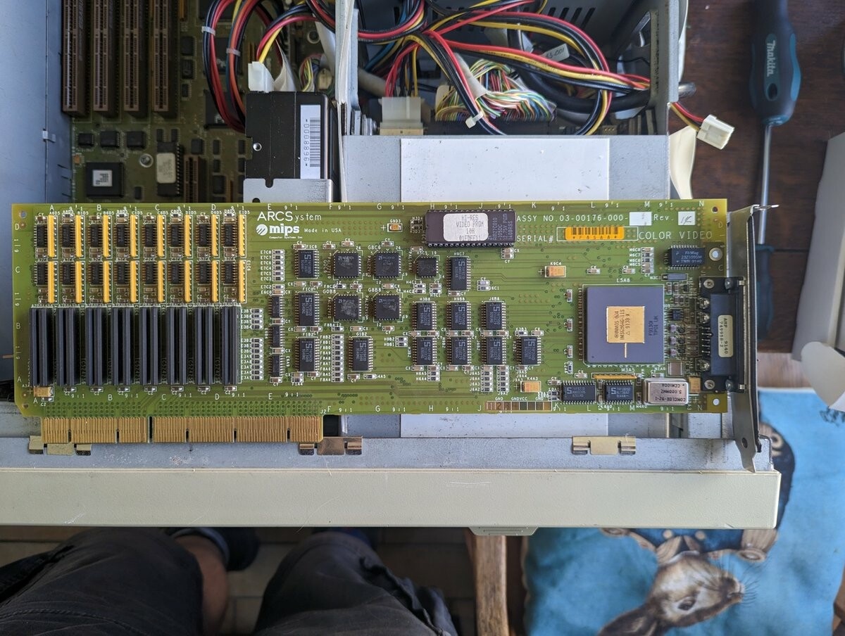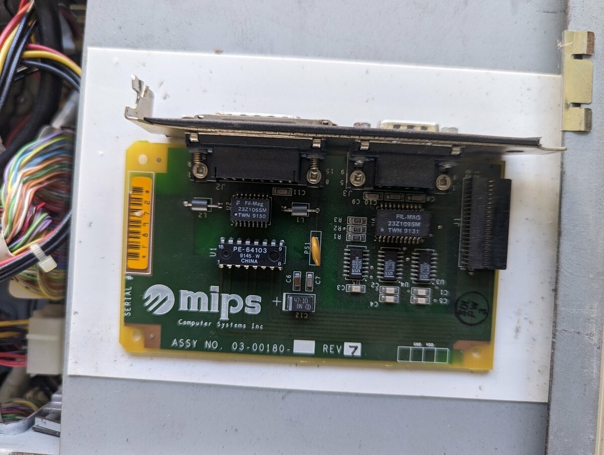 From the outside, the Magnum 4000 looked like a regular PC. There was a 100-MHz MIPS R4000 (on a 50-MHz internal bus) and 32-bit EISA bus for standard expansion cards (x86 option ROMs could be executed via emulation). The interesting part (for me) is the graphics hardware. There is a special 64-bit slot that allows attaching the graphics card directly to the processor bus to provide the maximum bandwidth. The card is based on a little-known INMOS G364 frame buffer with 2MB of video RAM. It supports only 256-color modes, no VGA compatibility and up to 1280×1024.